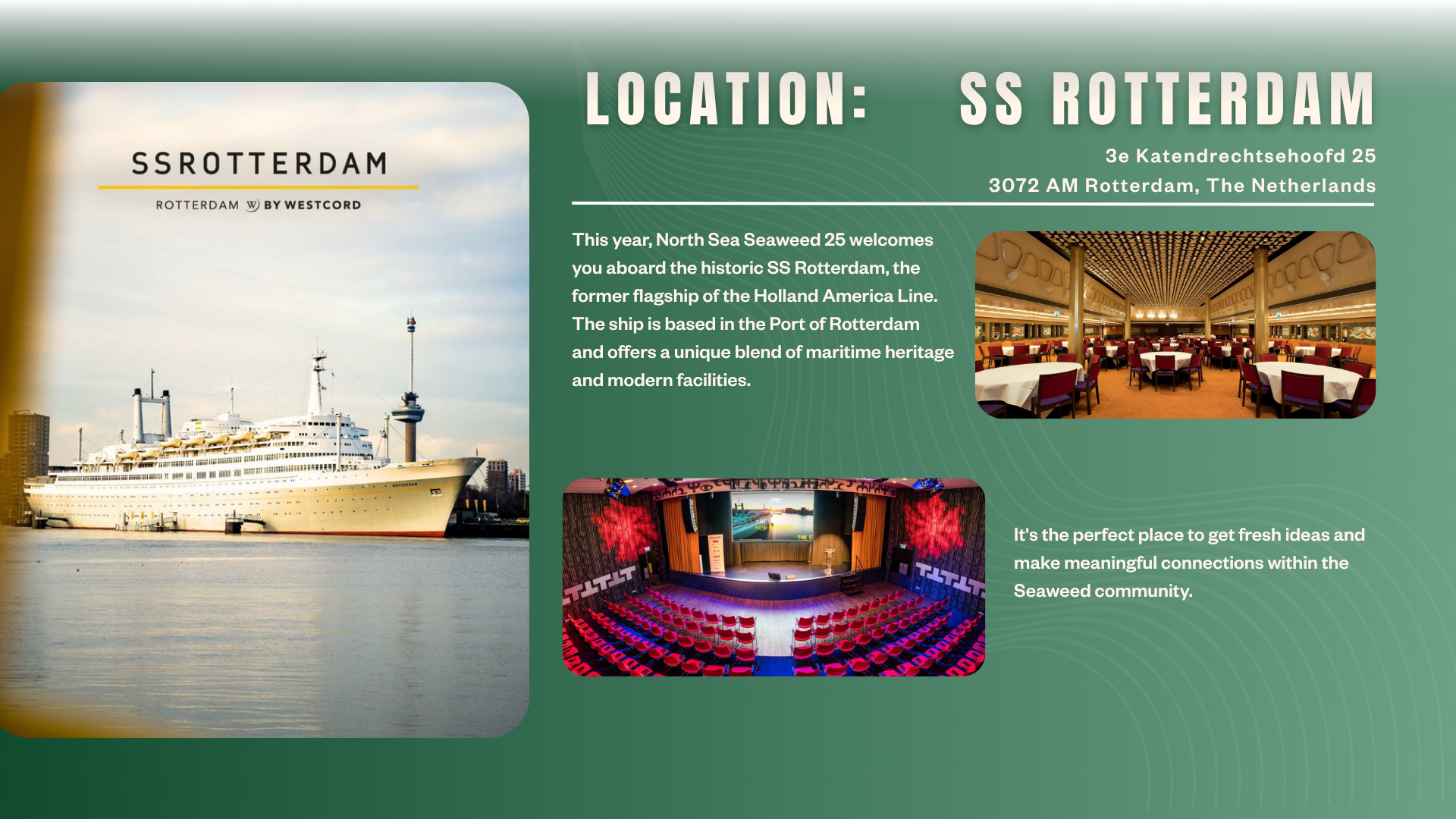 This year, North Sea Seaweed 25 welcomes you aboard the historic SS Rotterdam, the former flagship of the Holland America Line. The ship is based in the Port of Rotterdam and offers a unique blend of maritime heritage and modern facilities. It's the perfect place to get fresh ideas and make meaningful connections within the Seaweed community.