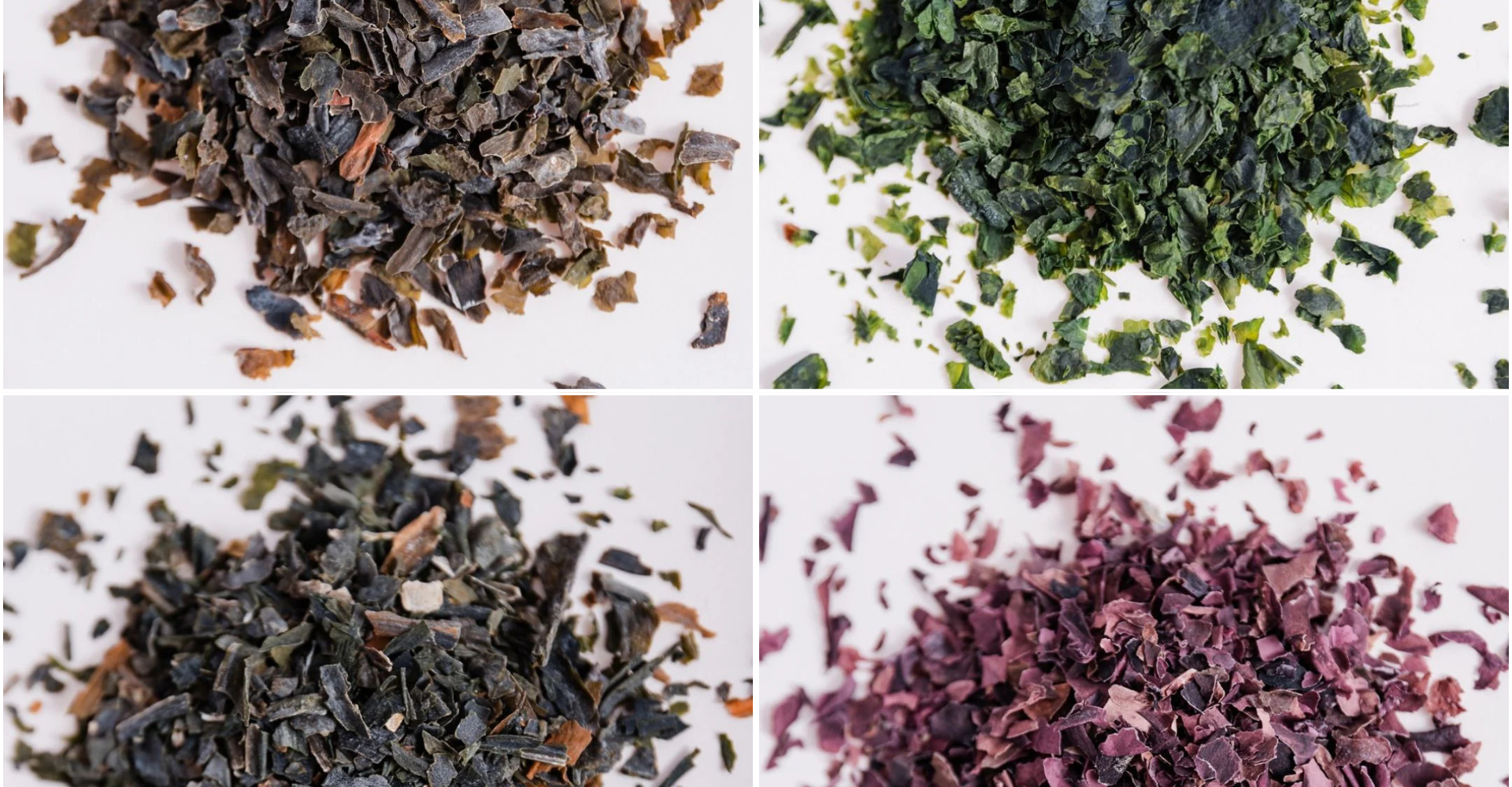 Different types of seaweed cultivated, harvested and processed by Neptune Elements into dried products.